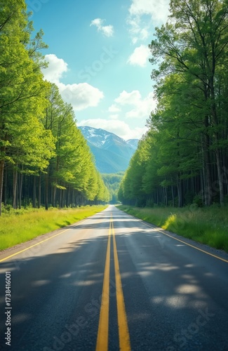 Straight road stretches through vibrant green forest on sunny day. Tall trees line asphalt path. Distant snow capped mountains rise under bright blue sky with fluffy white clouds. Perfect scene for