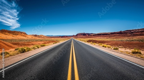 road, desert, landscape, red, rock, formation, blue, sky, straight, highway, arid, scenic, travel, journey, empty, horizon, perspective, nature, outdoors, sunny, clear, environment, wilderness, geology, southwest, asphalt, path, adventure, exploration, background, design