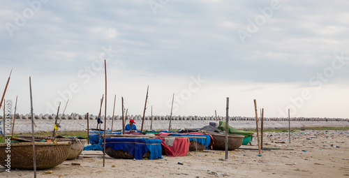 Strand mit Fischerbooten und Werft in Phan Thiet Vietnam