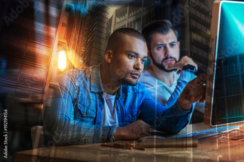 Strange information. Serious attentive young man pointing to the screen of a modern computer and feeling worried while showing strange information to his clever calm friend