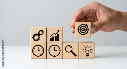 strategic, goal, setting, business, objective, time, management, idea, generation, success, productivity, sharpened, approach, achievement, planning, strategy, target, objective, outcome, result, performance, indicator, metric, analysis, evaluation, assessment, review, report, clock, gear, magnifier, light bulb, hand, block, cube, symbol, icon, arrow, chart, diagram, illustration, graphic, representation, progress, growth, development, improvement