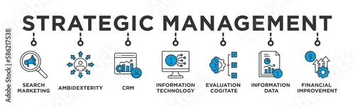 Strategic Management banner web icon vector illustration concept with icon of Search Marketing,Ambidexterity , CRM, Information Technology, Evaluation Cogitate, Information Data, Financial Improvement