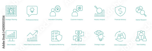 Strategic Planning, Innovation Consulting, Customer Analytics, and Financial Advisory Icons