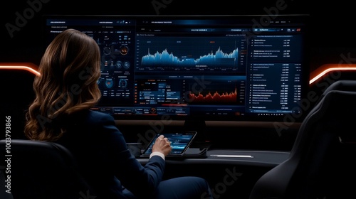 businesswoman, technology, monitor, screen, graph, chart, datum, business, woman, professional, modern, sleek, futuristic, digital, information, insight, strategy, planning, financial, investment, corporate, office, workplace, entrepreneur, executive, leadership, success, ambition, sharpened, concentration, intelligence, innovation, progress, future, vision, powerful, confident, determination, control, sophisticated, elegance