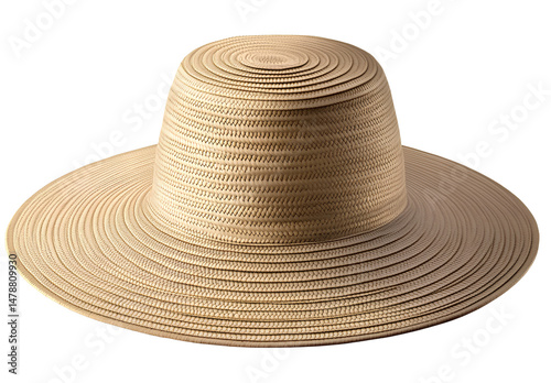 Straw sun hat, beige sundress-style summer cap with sun protection, isolated on transparent background, cutout PNG file