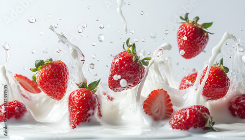 Strawberries and splashes of milk or yogurt in the air on a white background