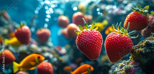 strawberry, strawberry, fruit, underwater, ocean, sea, coral, coral reef, fish, marine life, ocean life, diving, snorkeling, aquatic, water, blue, red, green, yellow, orange, colourful, vibrant, surreal, surrealism, fantasy, unusual, unexpected, nature, outdoors, environment, ecosystem, tropical, closeup, macro, detail, texture, food, underwater photography, closeup, drifting, floating