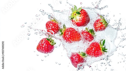 strawberry, water, splash, fruit, red, fresh, juicy, delicious, healthy, food, drink, vitamin, summer, sweet, tasty, natural, organic, vegan, vegetarian, diet, lifestyle, photo, studio, white, background, isolated, macro, close, up, detail, still, life, bright, colourful, glistening, wet, dripped, bubble, sprinkle, edible, ripe, garden, farm, market, produce, seasonal, agriculture