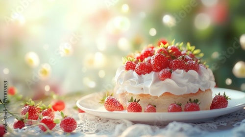 cake, strawberry, whipped, cream, dessert, sweet, food, summer, delicious, deliciously, tasty, fresh, red, fruit, nature, garden, sun, light, bokeh, background, beautiful, pastry, baking, confectionery, sugary, juicy, ripe, healthy, vitamin, antioxidant, springtime, spring, floral, white, plate, table, tablecloth, lace, garnish, topping, creamy, fluffy, organic, berry, treat, confection
