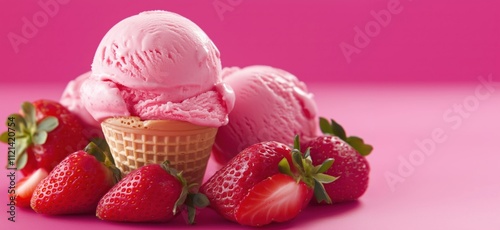 Strawberry ice cream with fresh strawberries, vibrant pink background, waffle cone, creamy texture, sweet dessert, copy space for text