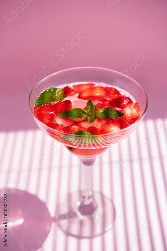 Strawberry refreshing cocktail with fresh mint on pink background with shadows. Close-up. Selective focus.
