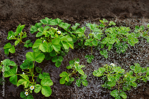 Strawberry seedling grows in the ground. Watering rows of strawberries