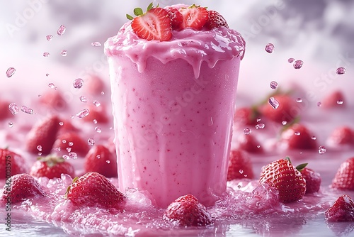 Strawberry Smoothie with Sliced Berries, Pink Liquid, Splashing Water Droplets around