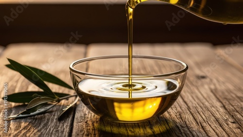 Stream of golden liquid pours from bottle into bowl, olive branch, on rustic wooden surface