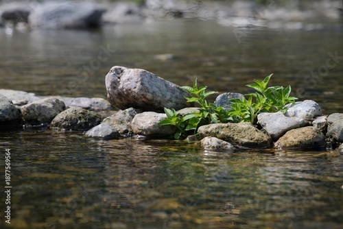 Streamside stones and vibrant greenery