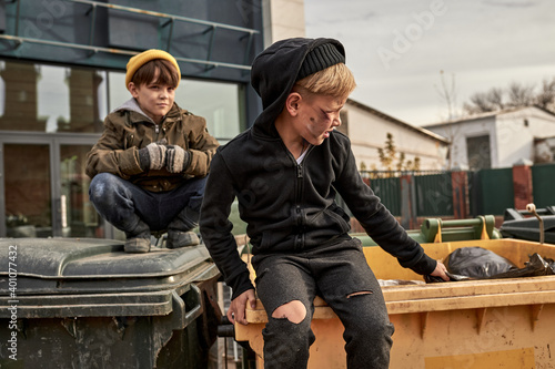 street boys look for food in the street trash can, dirty poor boys are despairingly try to find some food to survive