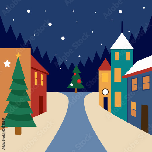 christmas, winter, house, snow, landscape, village, christmas, holiday, vector, home, tree, cartoon, night, illustration, scene, town, season, snowman, new year, building, window, sky, card, cold, city