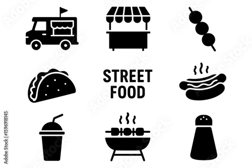 silhouette, minimalist, black, white, street, food, icon, snack, hamburger, taco, truck, kiosk, hot dog, skewer, drink, salt, grill, simple, bold, popular, market, urban, fast, outdoors, fresh, delicious, bar-b-q, casual attire, seller, culinary, set, summer