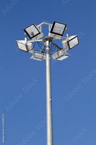 powerful, lighting, street light, street light, tall, pole, equipment, floodlight, lamp, reflector, lighting equipment, light, bulb, spotlight, color image, nobody, outdoors, electricity, copy space, photo, vertical, sky, blue