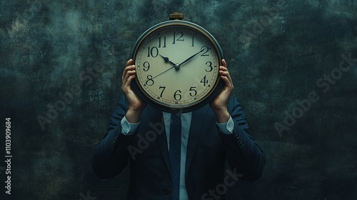 Stressed businessman holding a large clock, emphasizing a sense of urgency or deadline pressure