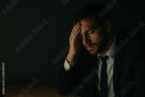 Stressed businessman in suit seated in dark office, contemplating work challenges