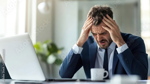 frustrate, businessman, hold, head, hand, symbolize, stress, burnout, workplace, pressure, business, worried, workspace, deadline, exhaust, goal, to sit, career, challenge, sharpened, gesture, indoor, balance, supply, hot drink, face, thinks, problem, despair, laptop, fatigue, portrait, time, office, cephalalgia, mental, experiencing, cope, modern, bankruptcy
