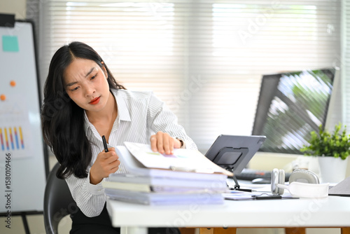 overworked, stressed, businesswoman, bookkeeper, paperwork, statistic, technology, entrepreneur, financial, working, businessperson, account, person, job, connection, one person, workplace, communicating, investor, asian, management, career, development, business, young adult, modern, lifestyle, concentration, web, remote, planning, laptop, analysing, checking, document, graph, strategy, examining, office, workspace, anxiety, frustration, struggle, deadline, problem, sleepy, distraught, worried, exhaustion