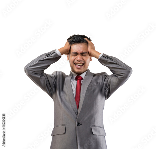 stressed young businessman holding his head isolated