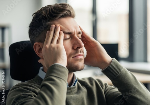 Stressed young man suffering from a severe headache, rubbing temples in pain at work.