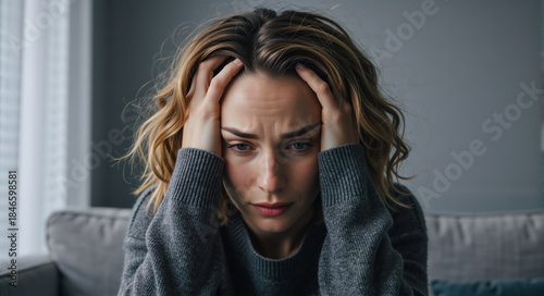 stress, anxiety, depression, woman, mental health, sad, pain, cephalalgia, problem, worry, burnout, sleepy, emotional, despair, sorrowful, suffering, crisis, trouble, frustration, exhausted, lonely, hopeless, grief, migraine, disease, disorder, psychology, therapy, help, adult, caucasian, face, head, hand, thinking, alone, solitude, home, indoor, portrait, life, difficult, pressure, issue, upset, unhappy, female