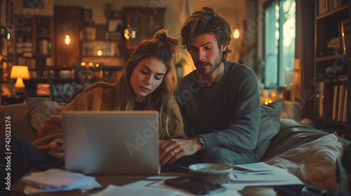 Stressful Accounting at Home: Asian Couple Using Laptop Computer, Sitting on Sofa in Apartment. Young Family Filling Tax Forms,
