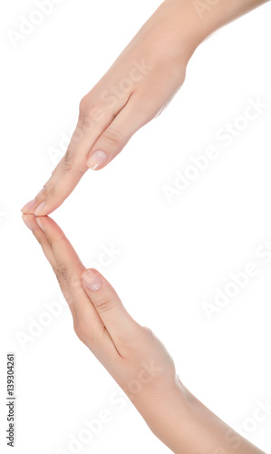 Stretched hand of woman isolated over white background. Open palm hand gesture of woman hand. Close up of open palm isolated over white background.