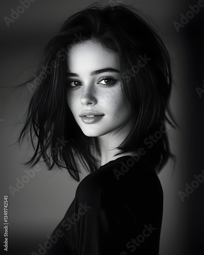 woman, portrait, beauty, fashion, glamour, model, feminine, elegant, style, smile, confidence, charme, gaze, shoulder, vignetting, engraving, black-and-white, high contrast, fictional, character, aesthetic, female, face, expression, mood, pose, monochrome, digital, rendering, vision, profile, attitude, allure, mystique, captivating, compelling, striking, evocative