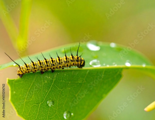 Striking caterpillar feasting on a dewy leaf, showcasing nature's transformation