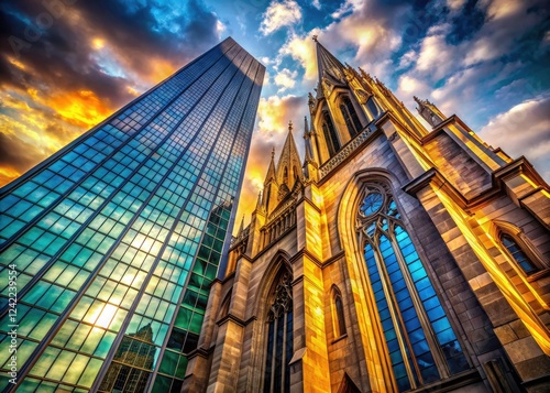 city landscape, modern architecture, building, skyscraper, cathedral, clash, contrast, texture, shadow, light, city, urban, modern building, detailed, sharp, photorealistic, hi-res, image, photo, visual, aesthetic, design, structure, city landscape, building exterior, urban scene, city view, building design, urban development, building material, building construction