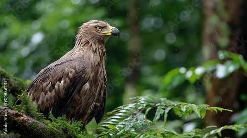 Striking golden eagle proudly perching on branch, defocused vibrant rainforest, lush greenery surrounding, power freedom and nature connection sense conveying, with copy space