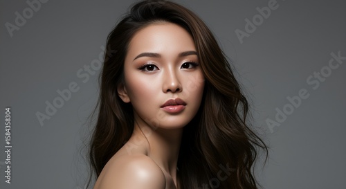 Striking portrait of a beautiful Asian woman with flowing hair and flawless skin, looking serene.