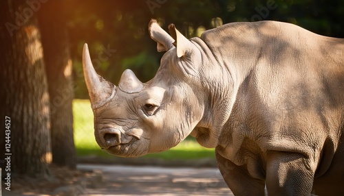 Striking Rhino UpClose in a Zoo Enclosure, Majestically Framed by Green Vegetation and Natural Light Filtering Through, Showcasing the Power and Grace of This African Mammal.