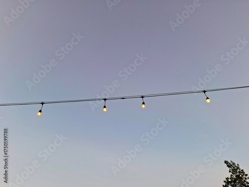 String lights glowing at sunset with a deep blue sky and silhouettes of trees, creating a cozy and romantic outdoor evening atmosphere perfect for backyard or café decoration.