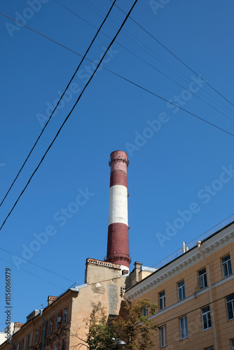 chimney, pipe, factory, industry, sky, smoke, power, pipe, industrial, environment, blue, technology, striped, air, chemical, manufacturing, smokestack, high, tall, ecology, city, town, building, energy, architecture, white, red, old, tower