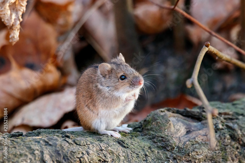 Striped field mouse sitting on fallen tree in park in autumn. Cute little common rodent animal in wildlife.