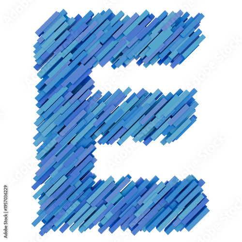 striped letter E made of blue 3d bars, arial font, isolated on transparent background - design element cut-out graphics object