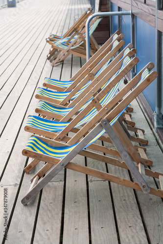wooden, beach chair, chair, chair, beach, sea, water, summer, vacation, travel, blue, relax, wood, coast, sky, deck, pier, holiday, view, rest, relaxation, striped