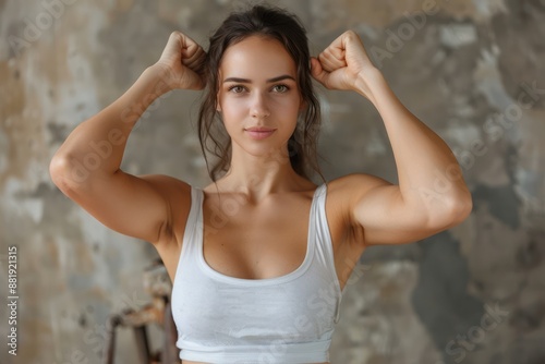Strong and Confident Woman Empowering Fitness and Strength Training with a Determined Mindset, A Photo of a Woman Showing Off Her Toned Arms and Strong Physique