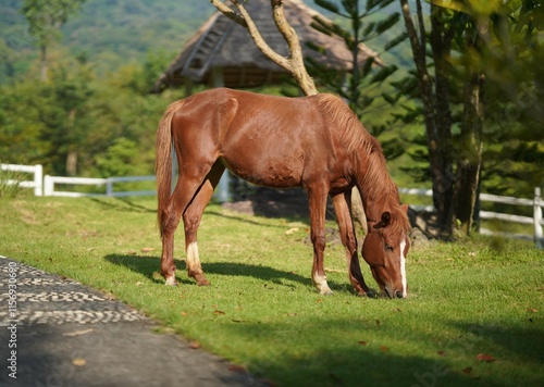 Strong, beautiful and Charming brown horse eating green grass nearby the house portrait photo with forest background