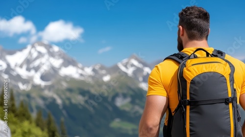 Strong man embarks on an alpine hiking adventure with a robust backpack