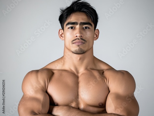 Strong muscular man with intense expression and extreme upper body definition flexing arms against neutral backdrop showcasing peak physical strength and bodybuilding aesthetics