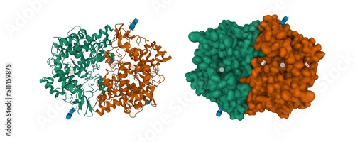 Structure of unoccupied cyclooxygenase-1 homodimer. 3D cartoon and Gaussian surface models, PDB 3n8v, chain id color scheme, white background