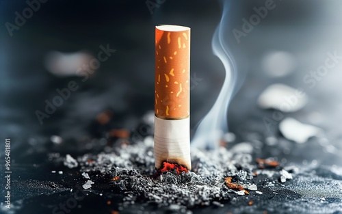 Stubbed cigarette in ash with rising smoke – Concept for smoking, health risks, and tobacco use