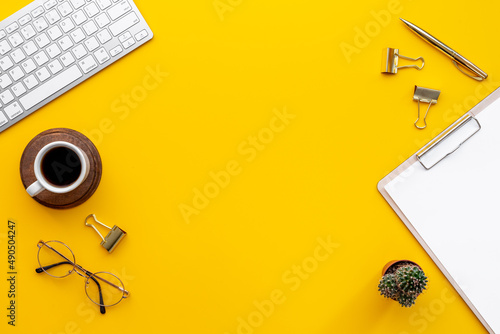 desk, table, office, workspace, business, student, workplace, desktop, top, space, view, notebook, modern, keyboard, design, cup, empty, blank, copy, background, work, up high, computer, hot drink, overhead, white, paper